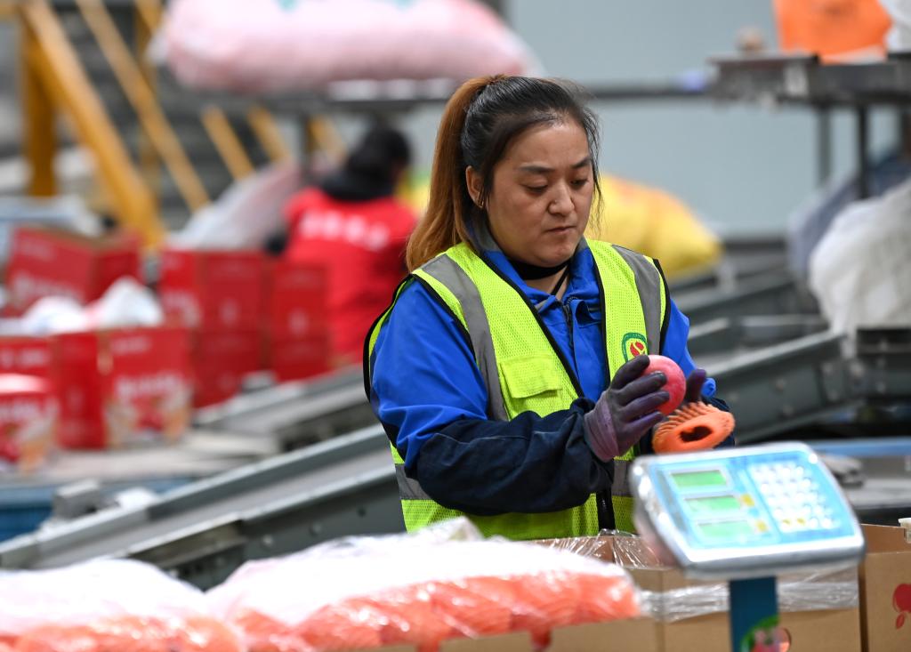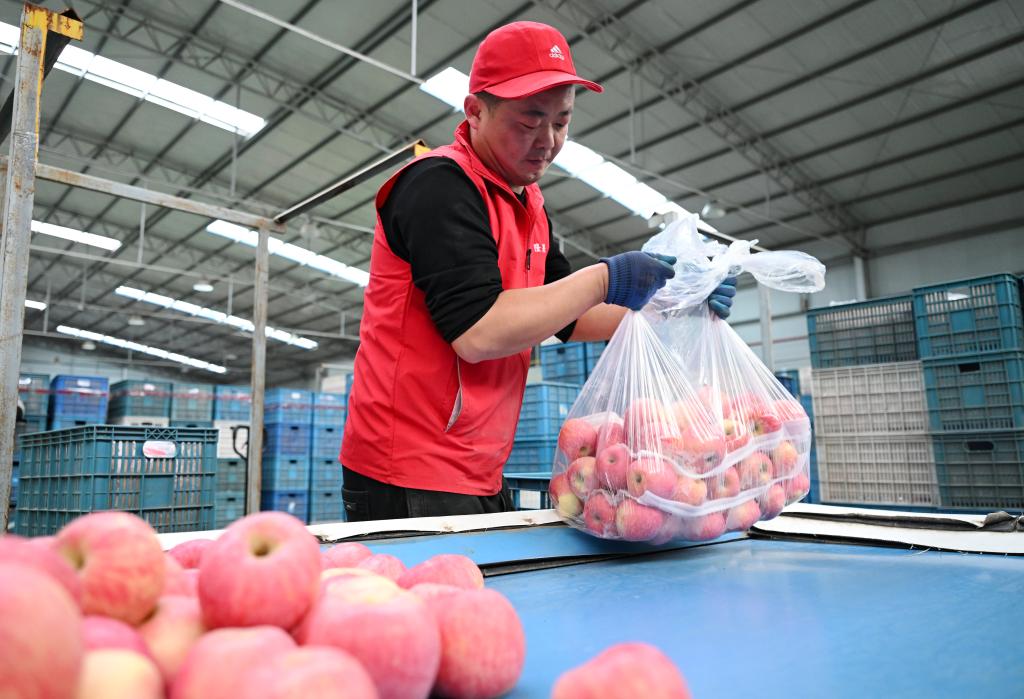 18日、白水県の協同組合でリンゴを仕分ける従業員。(白水=新華社記者/李一博)