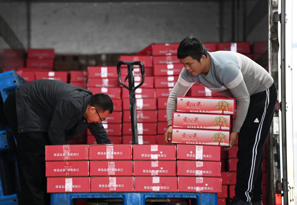 18日、リンゴの栽培や加工、輸出などを手がける地元企業の盛隆果業で箱詰めされたリンゴをトラックに積み込む従業員。(白水=新華社記者/李一博)