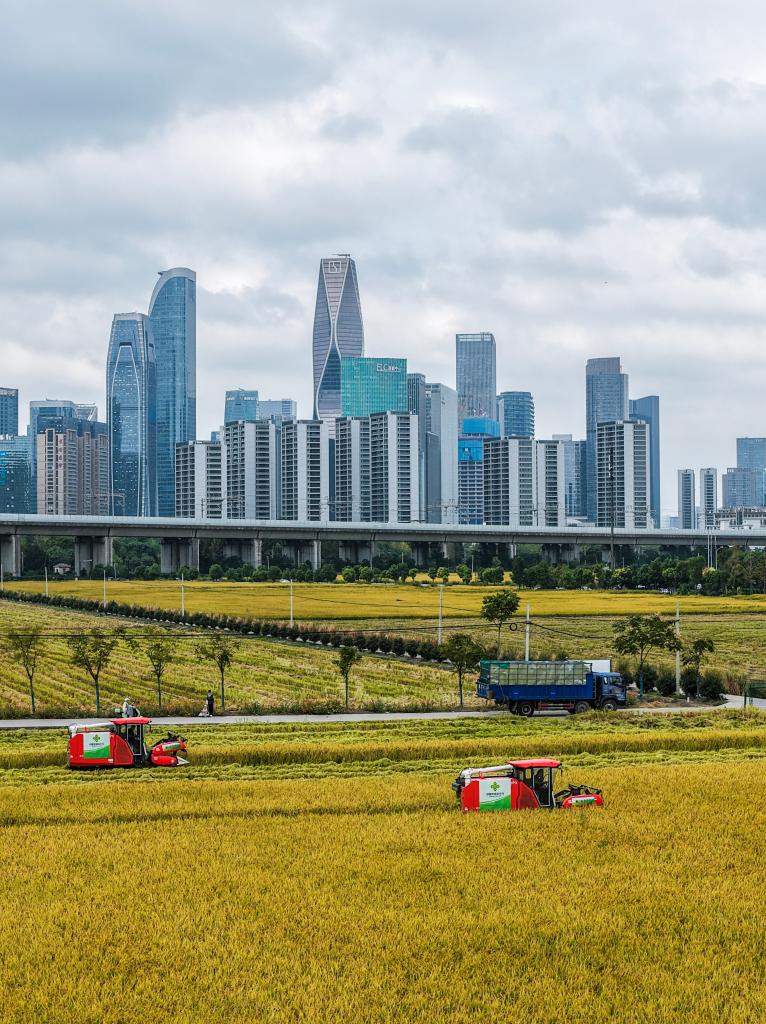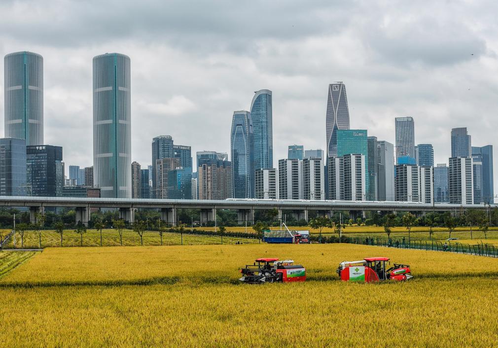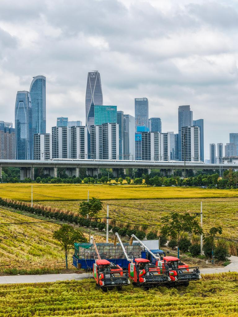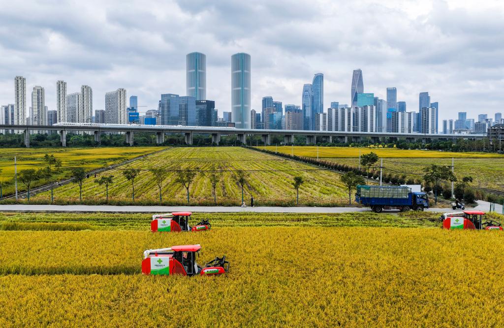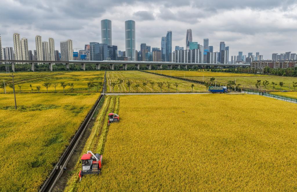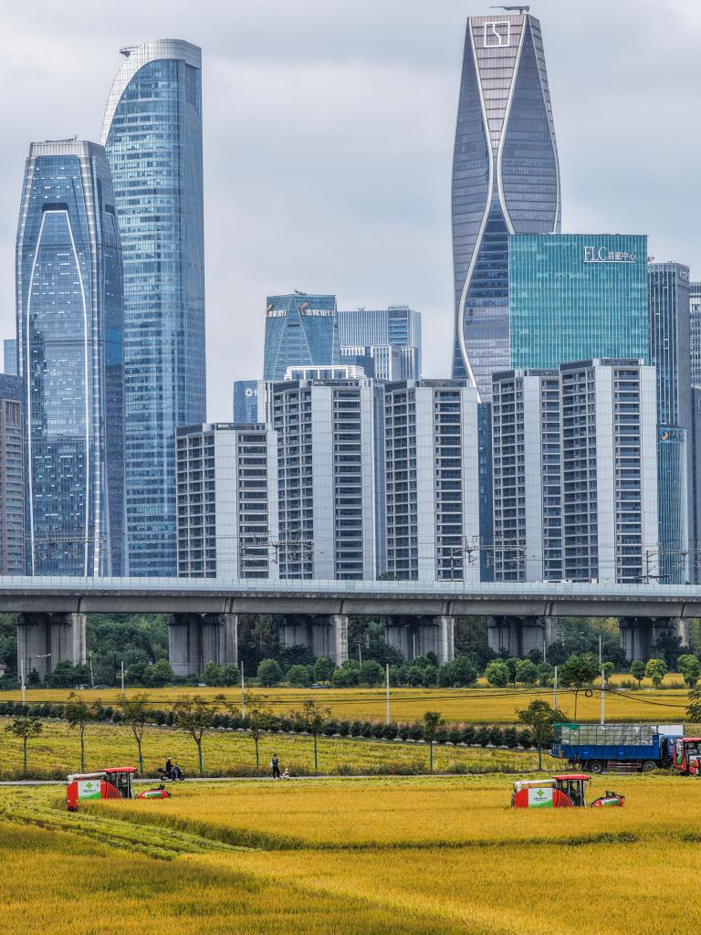 【新華社杭州10月22日】中国浙江省杭州市蕭山区で3千ムー(約200ヘクタール)余りに及ぶ水稲が収穫期を迎えた。黄金色の水田が、高速鉄道や遠くに立ち並ぶ高層ビルと重なり合い素晴らしい景観を見せている。