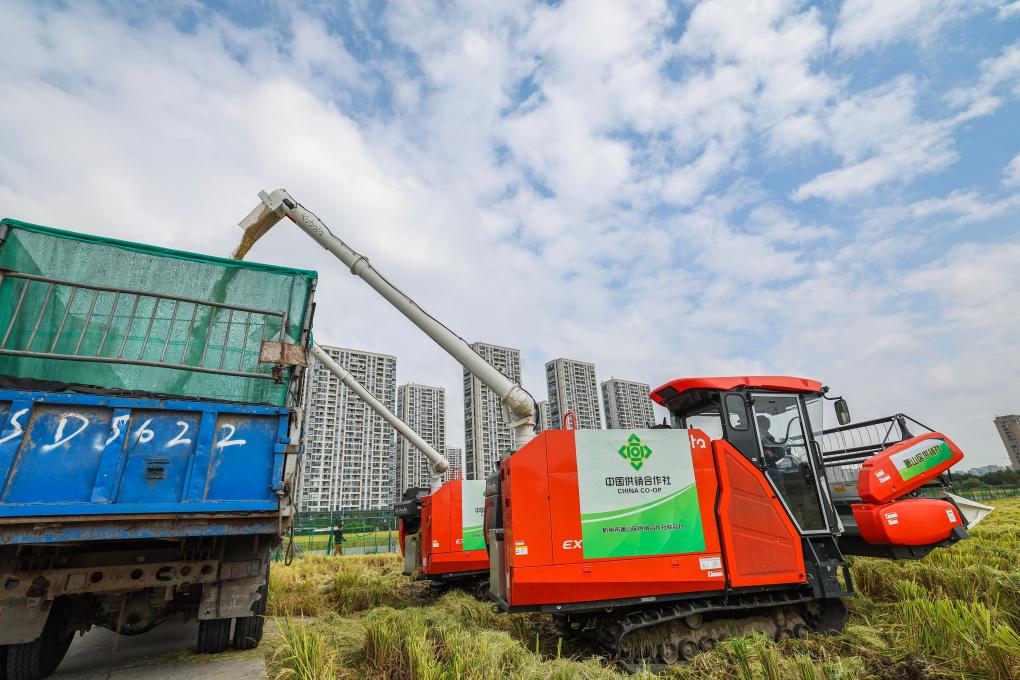 21日、収穫した稲を車に積み込むコンバイン。(杭州=新華社記者/徐昱)