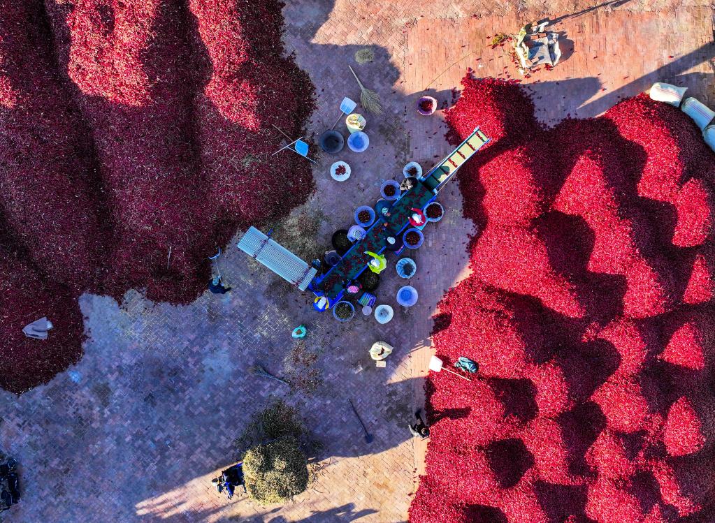 19日、開魯県東風鎮六合堂村の一角に積まれた赤トウガラシ。農家が仕分け作業に当たっている。(ドローンから、通遼=新華社記者/連振)