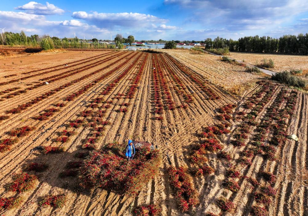 19日、開魯県東風鎮六合堂村の畑で、赤く熟したトウガラシを収穫する農家。(ドローンから、通遼=新華社記者/連振)