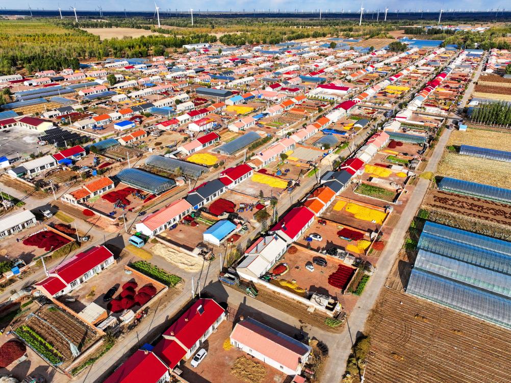 19日、上空から撮影した開魯県東風鎮六合堂村。農家の庭に積み上げられている赤トウガラシ。(ドローンから、通遼=新華社記者/連振)