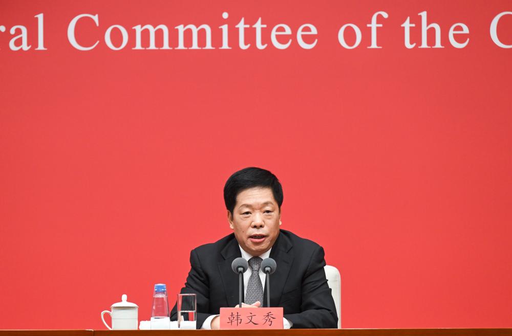 24日、記者会見で発言する中国共産党の韓文秀(かん・ぶんしゅう)中央財経委員会弁公室副主任(日常業務担当)・中央農村工作指導小組弁公室主任。(北京=新華社記者/金良快)