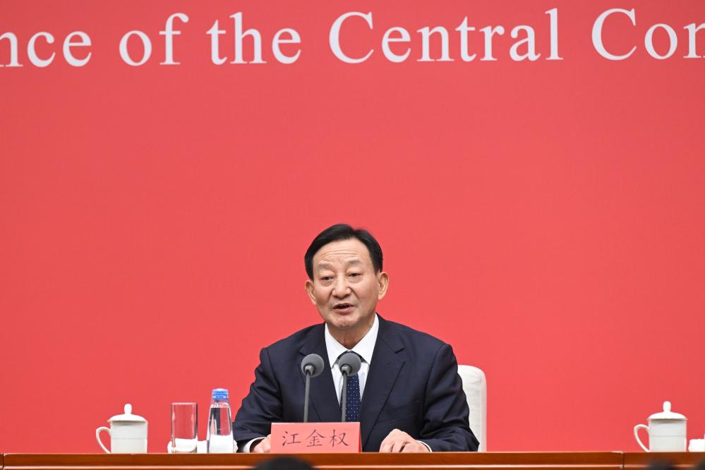 24日、記者会見で発言する中国共産党中央委員会政策研究室の江金権(こう・きんけん)主任。(北京=新華社記者/金良快)