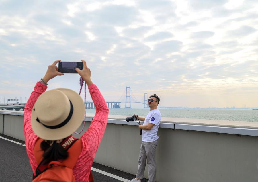25日、深中通道・西人工島で写真を撮る観光客。(深圳=新華社記者/毛思倩)