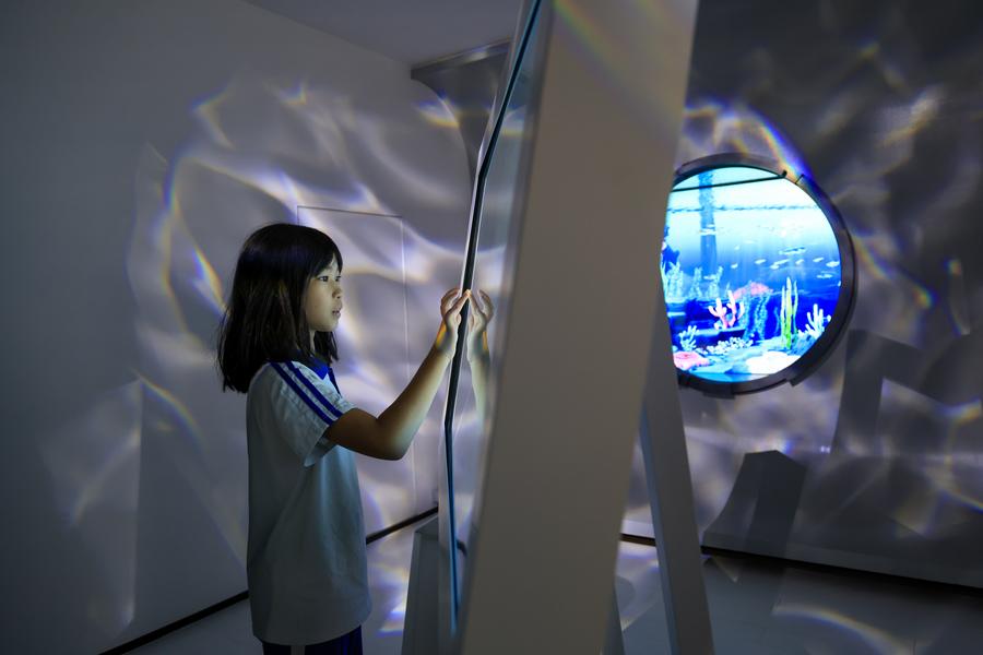 25日、深中通道・西人工島の粤港澳大湾区(広東・香港・マカオグレーターベイエリア)海水域横断ルートの広報施設で双方向型ゲームを体験する子ども。(深圳=新華社記者/毛思倩)