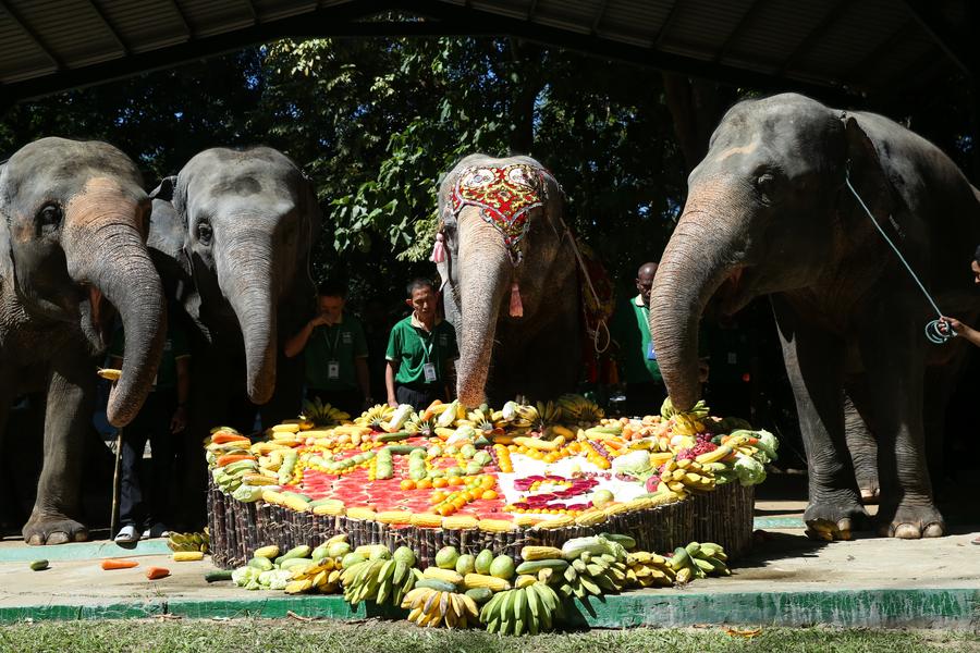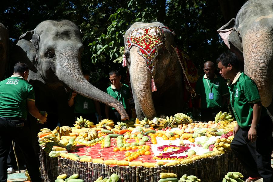 26日、ヤンゴン動物園で、果物や野菜などで作られた誕生日のごちそうを食べるモモ(右から2頭目)。(ヤンゴン=新華社配信)
