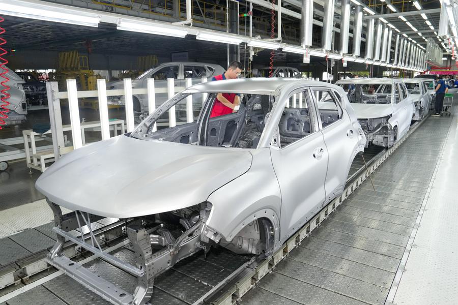 中韓(塩城)産業パークにある起亜と江蘇悦達集団の合弁会社、江蘇悦達起亜汽車の生産ラインで働く従業員。(10月16日撮影、塩城=新華社記者/李博)