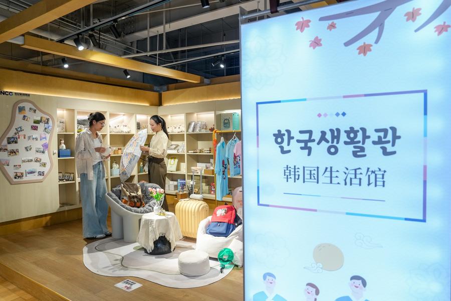 塩城中韓文化ホールの韓国生活館で商品を選ぶ観光客。(10月16日撮影、塩城=新華社記者/李博)