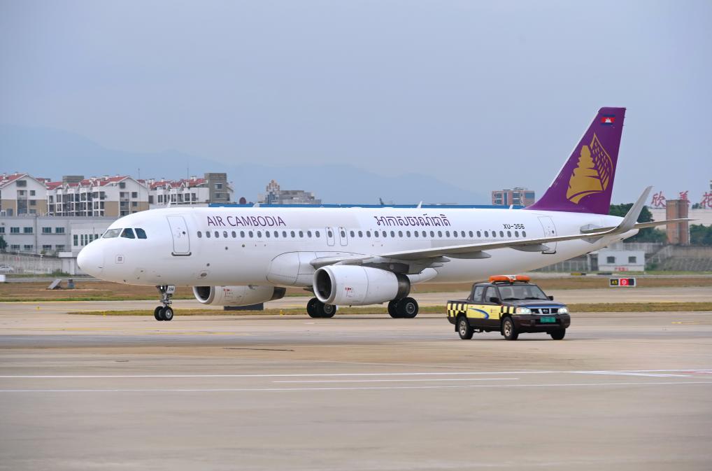 26日、福建省福州市の福州長楽国際空港に到着したプノンペン発のエア・カンボジア機。(福州=新華社記者/林善伝)