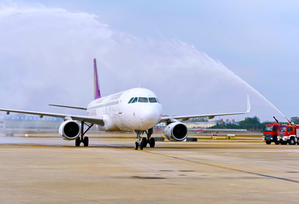 26日、福建省福州市の福州長楽国際空港で、ウオーター・サルート(水門礼)による歓迎を受けるプノンペン発のエア・カンボジア機。(福州=新華社記者/林善伝)