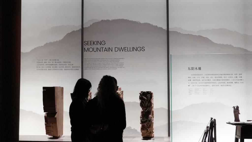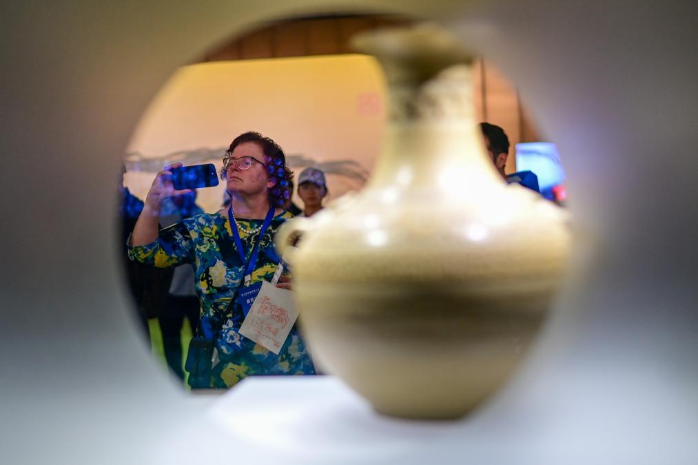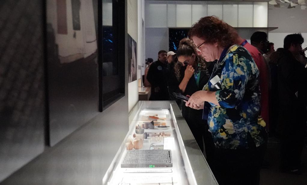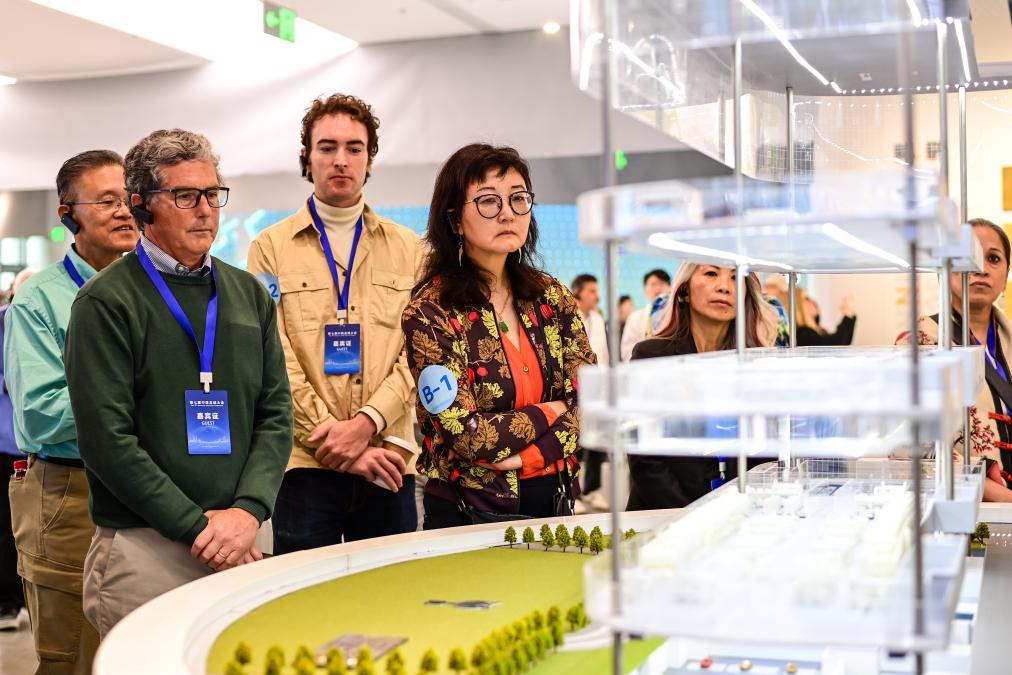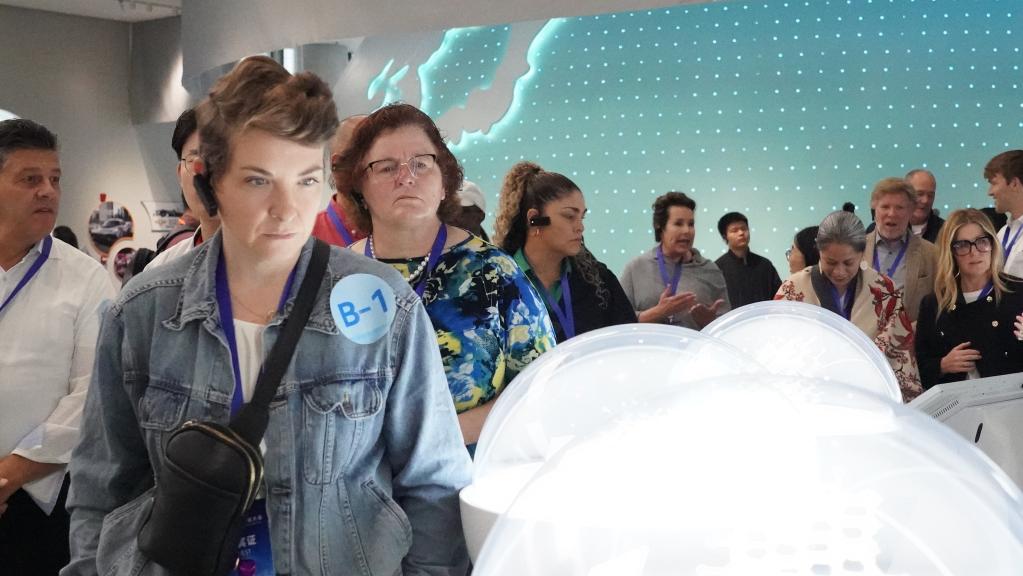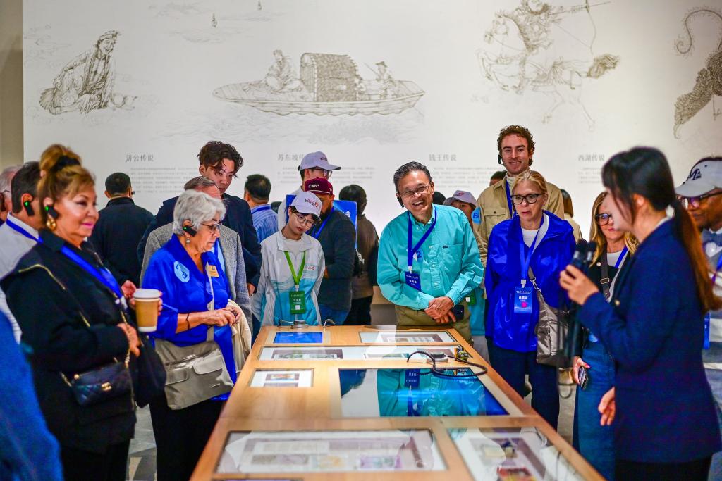 26日、杭州市にある複合文化施設「之江文化センター」内の浙江省無形文化遺産館を視察する中米友好都市大会に参加したゲスト。(杭州=新華社記者/張曼怡)