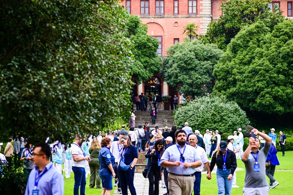 25日、杭州市内の浙江大学之江キャンパスを訪問した中米友好都市大会に参加したゲスト。(杭州=新華社記者/江漢)