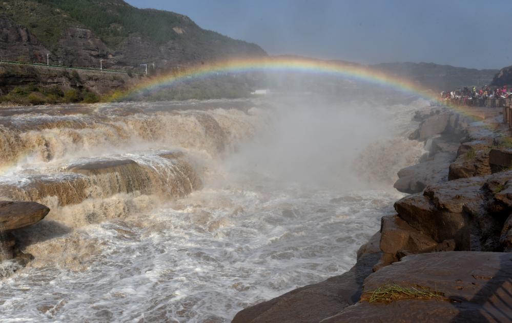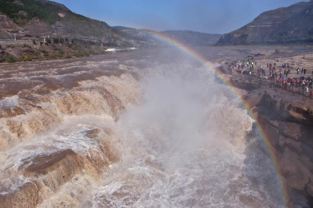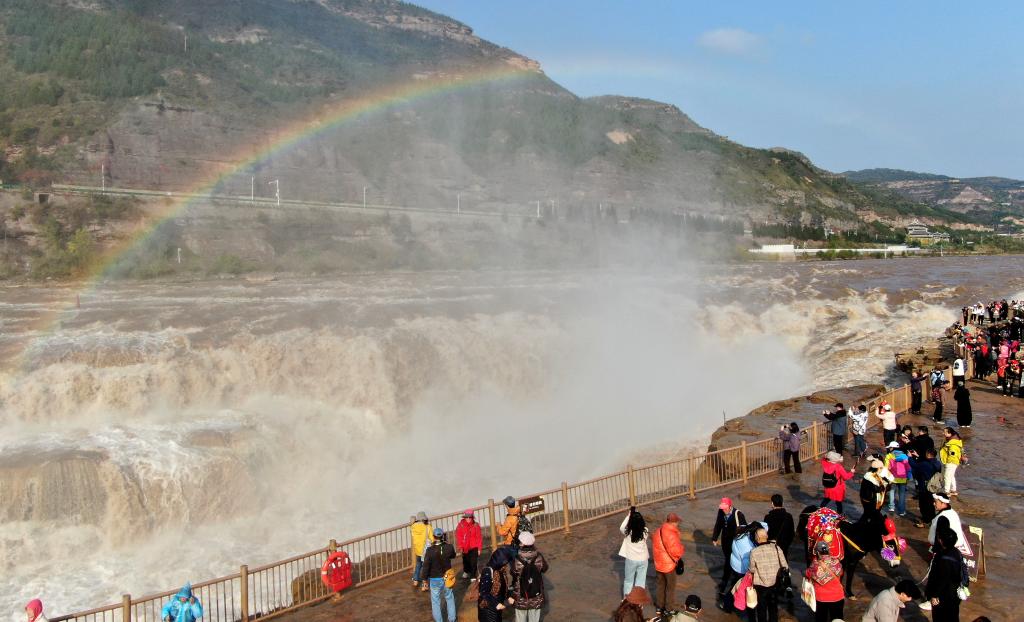 【新華社臨汾10月29日】中国山西省臨汾市吉県と陝西省延安市宜川県の境に位置する黄河壺口瀑布は27日、青空が広がり、激流が上げる水しぶきが太陽の光を反射して、壮大な虹を作り出した。