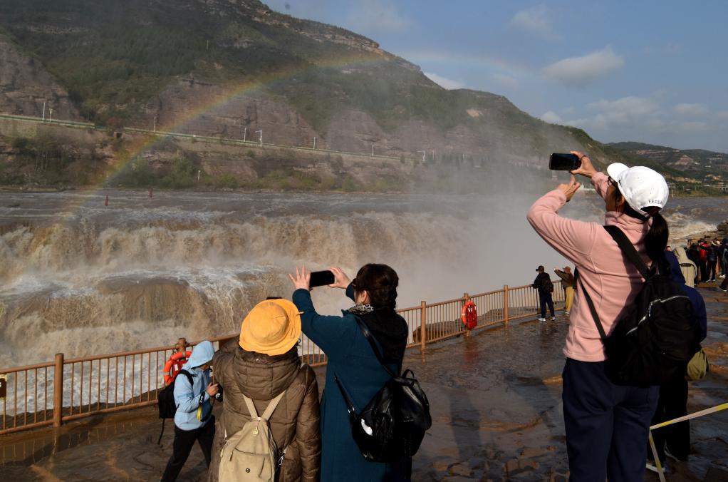27日、黄河壺口瀑布の虹を撮影する観光客。(臨汾=新華社配信/呂桂明)