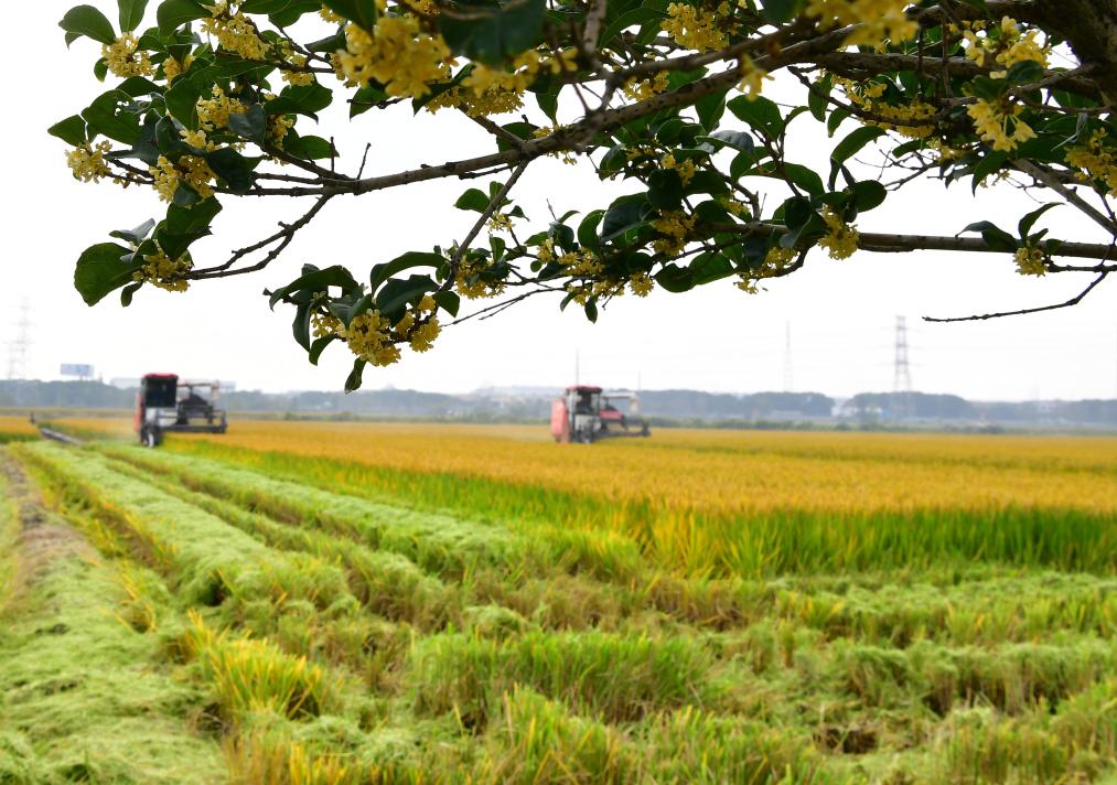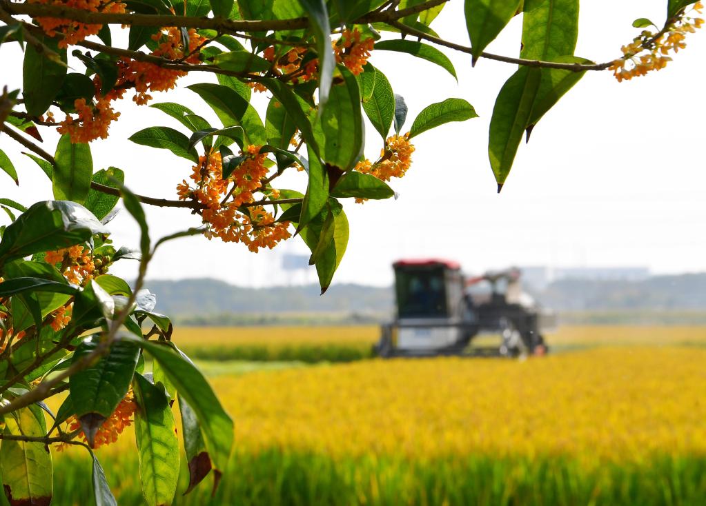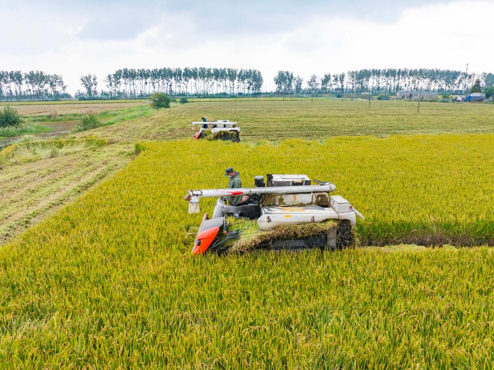 27日、江蘇省無錫市恵山区で稲刈りをするコンバイン。(無錫=新華社配信/還月亮)