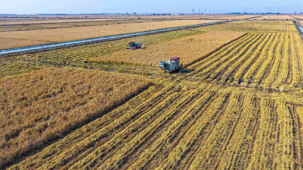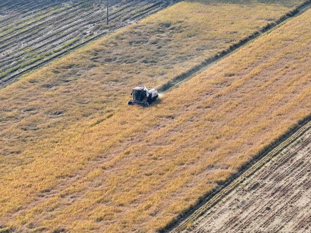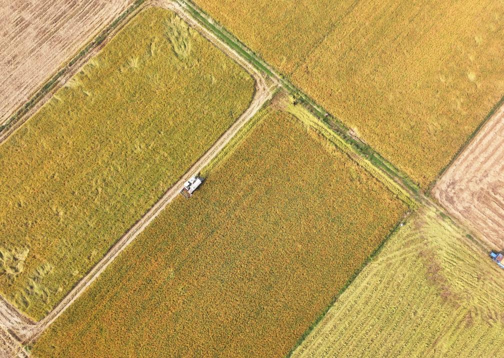 27日、河北省唐山市の海港経済開発区で稲刈りをするコンバイン。(ドローンから、唐山=新華社配信/劉満倉)