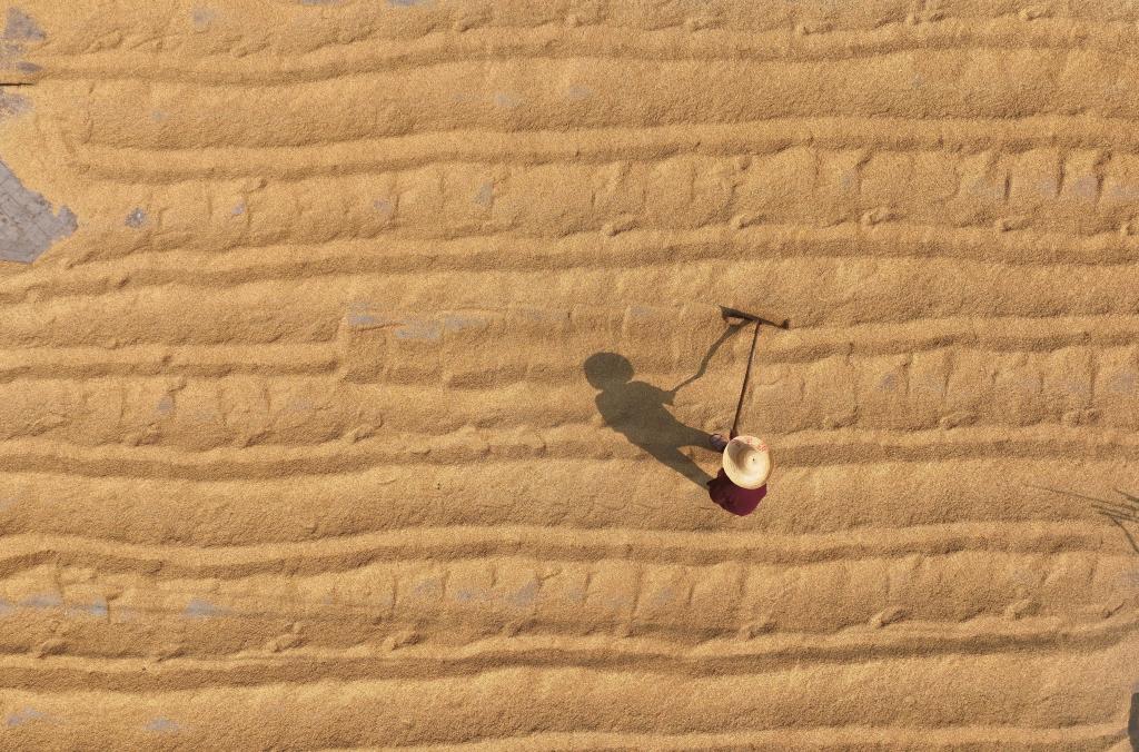 28日、湖南省衡陽市衡山県で稲もみを天日干しする地元住民。(ドローンから、衡陽=新華社配信/曹正平)