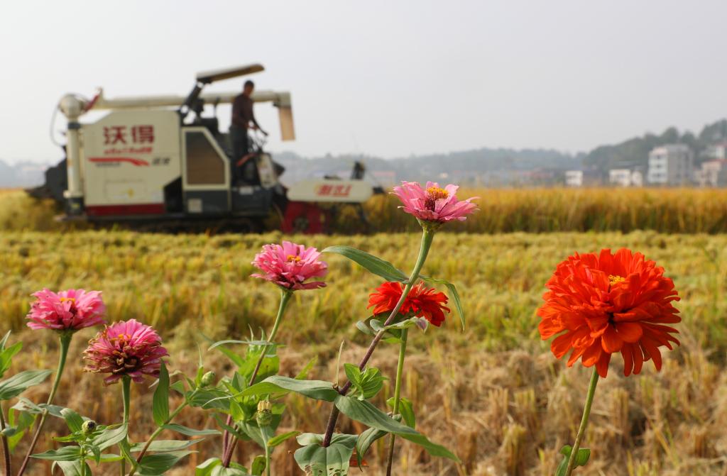28日、湖南省衡陽市衡山県で稲刈りをするコンバイン。(衡陽=新華社配信/曹正平)