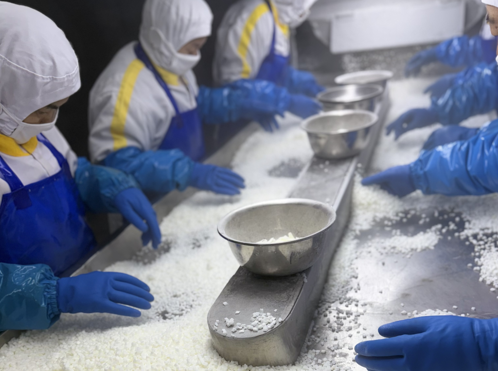 22日、山東鑫碩食品で冷凍カットタマネギを処理する従業員。(済南=新華社配信)