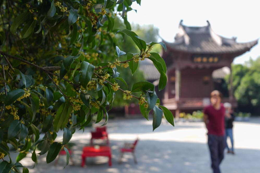 29日、杭州市のモクセイの名所「満覚隴」で撮影を楽しむ観光客。(杭州=新華社記者/黄宗治)