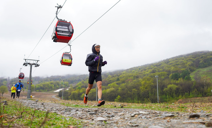吉林省吉林市の松花湖スキー場でクロスカントリー競走に参加するアウトドアスポーツの参加者。(5月1日撮影、吉林=新華社記者/顔麟蘊)