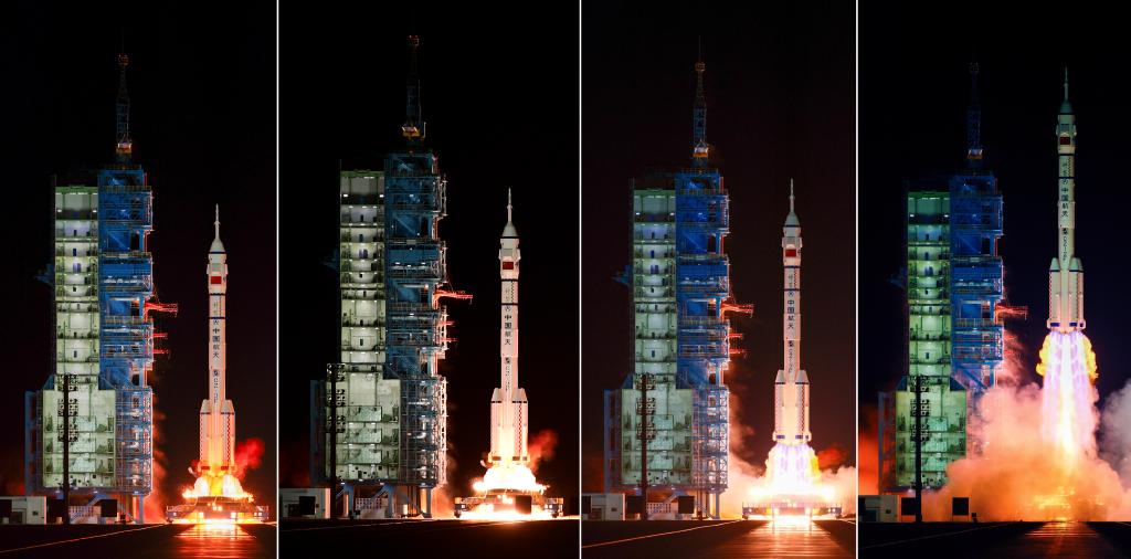 10月31日、有人宇宙船「神舟21号」を搭載し、酒泉衛星発射センターから打ち上げられる「長征2号F遥21」。(組み合わせ写真、酒泉=新華社配信)