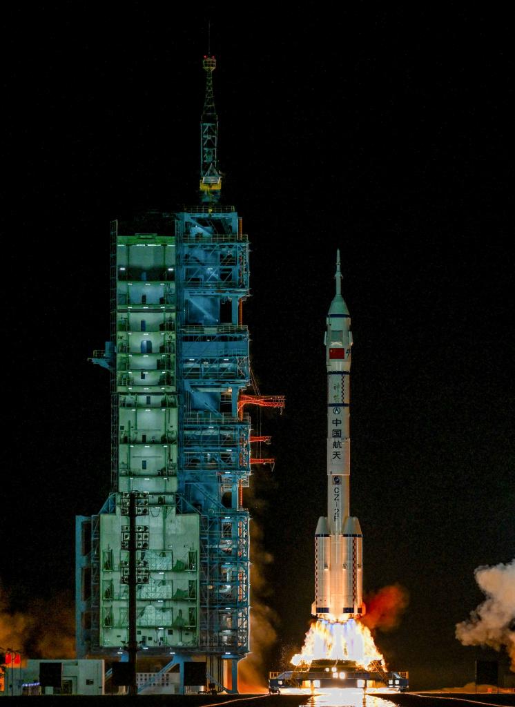 10月31日、有人宇宙船「神舟21号」を搭載し、酒泉衛星発射センターから打ち上げられる「長征2号F遥21」。(酒泉=新華社記者/李明剛)