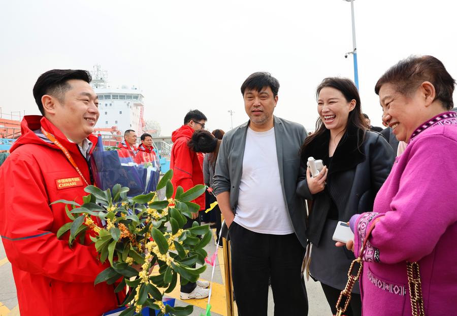 1日、家族から贈られたキンモクセイの花束を持ち、別れを告げる科学観測隊の隊員。(上海=新華社記者/方喆)