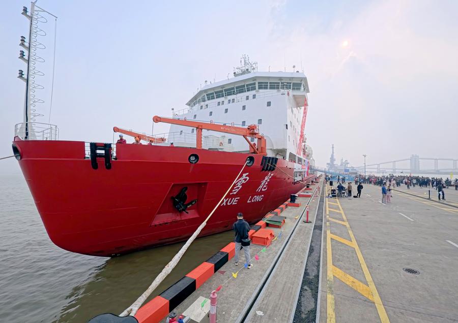 1日、中国極地調査国内基地ふ頭で停泊する極地調査砕氷船「雪竜2」。(上海=新華社記者/方喆)