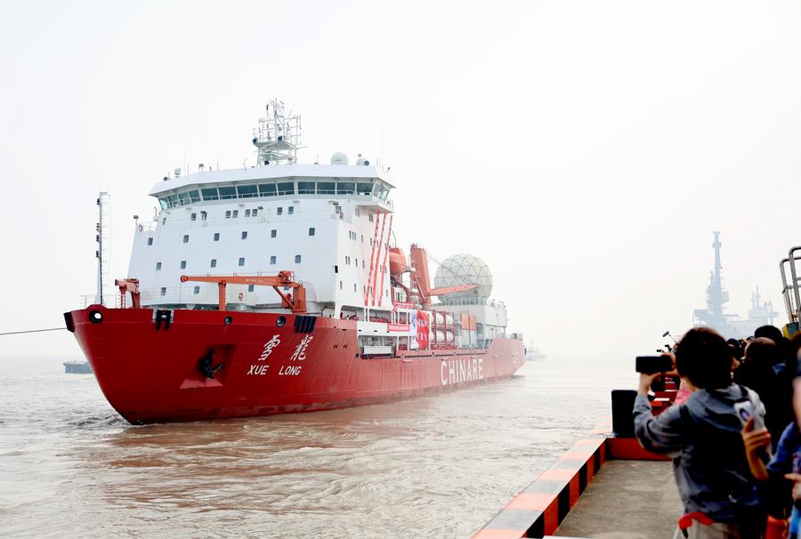 1日、中国極地調査国内基地ふ頭から出航する極地調査砕氷船「雪竜」。(上海=新華社記者/方喆)