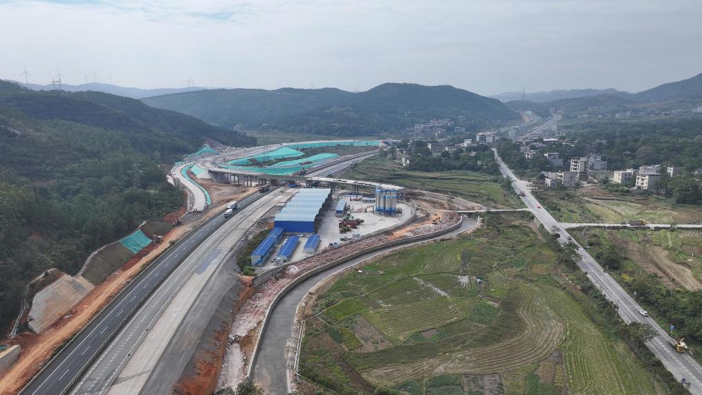 10月24日、京港澳高速道路の拡幅工事現場で撮影した宜章北インターチェンジ。(ドローンから、長沙=新華社記者/陳沢国)