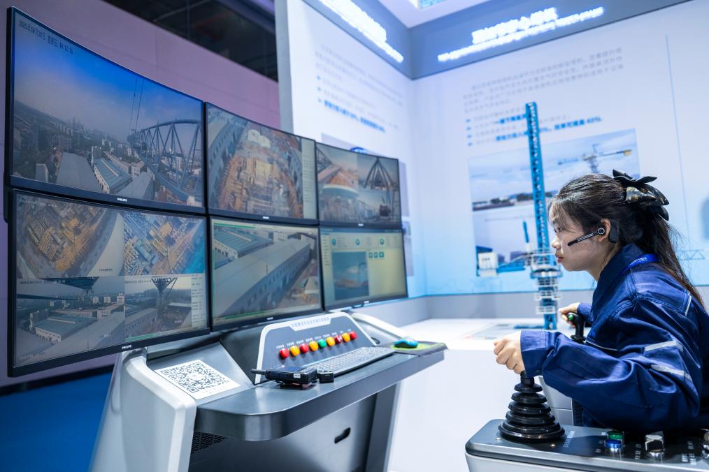 10月31日、2025国際(武漢)スマート建設産業博覧会で、タワークレーンのスマート集中制御システムを実演するスタッフ。(武漢=新華社記者/伍志尊)