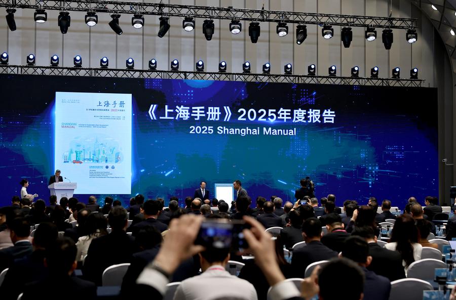 10月26日、上海市で開かれたSDG都市グローバル会議の全体会議で発表された「上海マニュアル」2025年度報告。(上海=新華社記者/方喆)