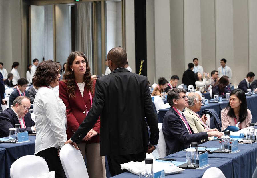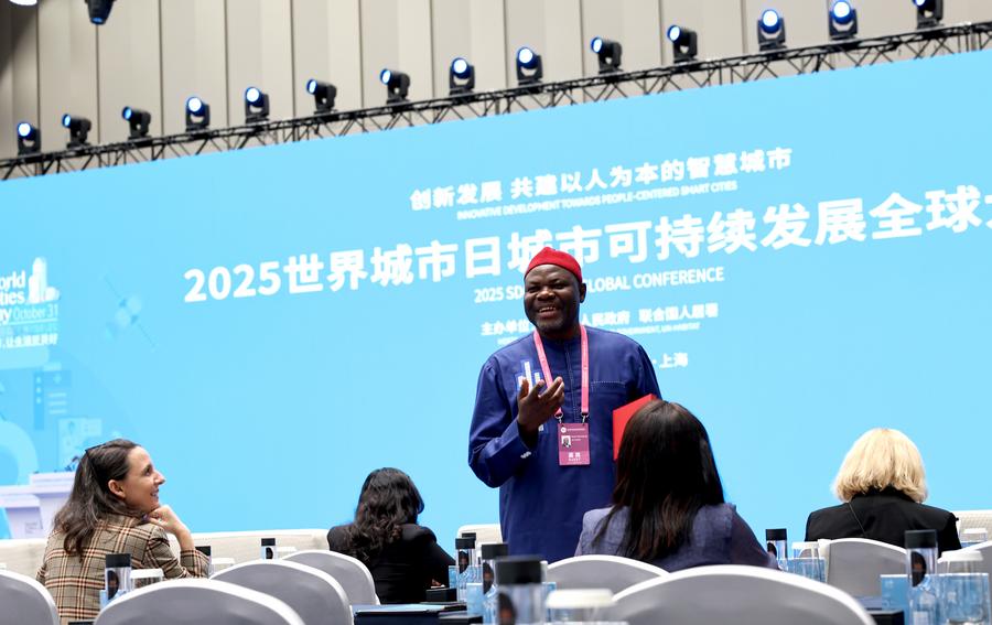 10月26日、上海市で開かれたSDG都市グローバル会議の全体会議場で交流する出席者。(上海=新華社記者/方喆)