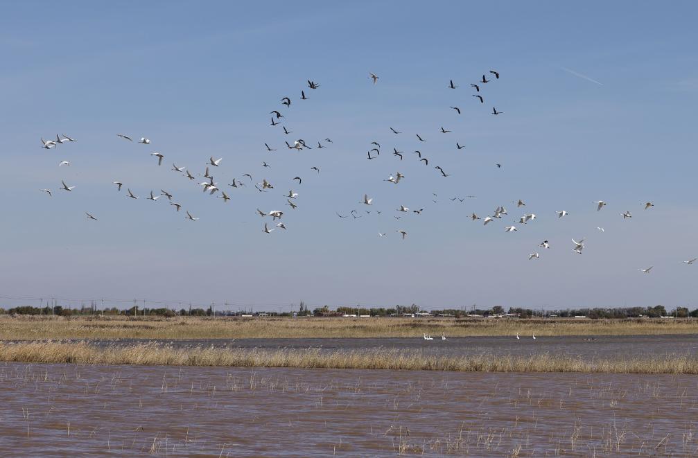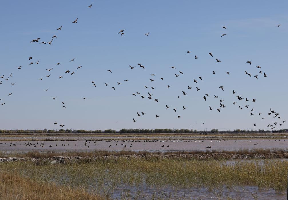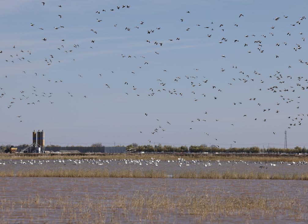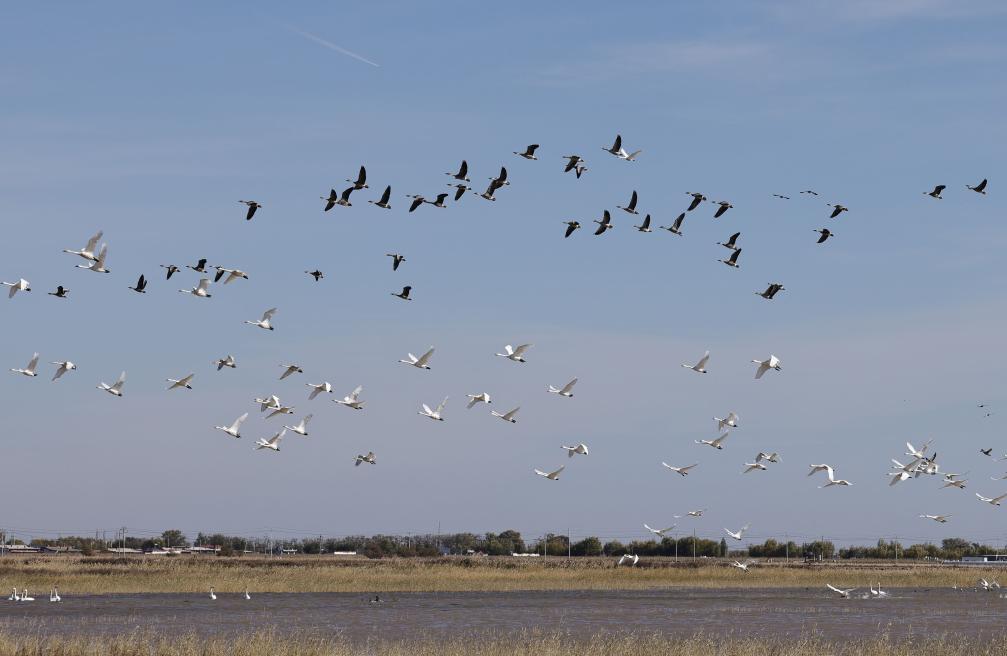 10月31日、内モンゴル自治区包頭市トゥムド右旗で撮影した渡り鳥。(フフホト=新華社記者/賈立君)