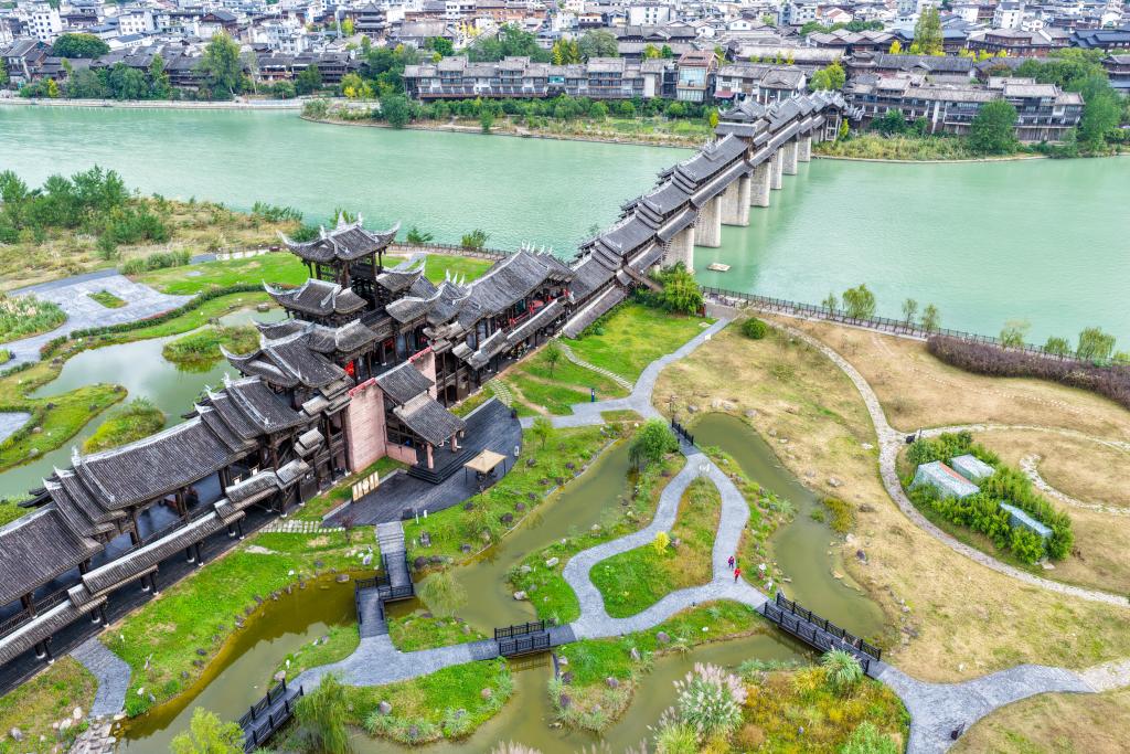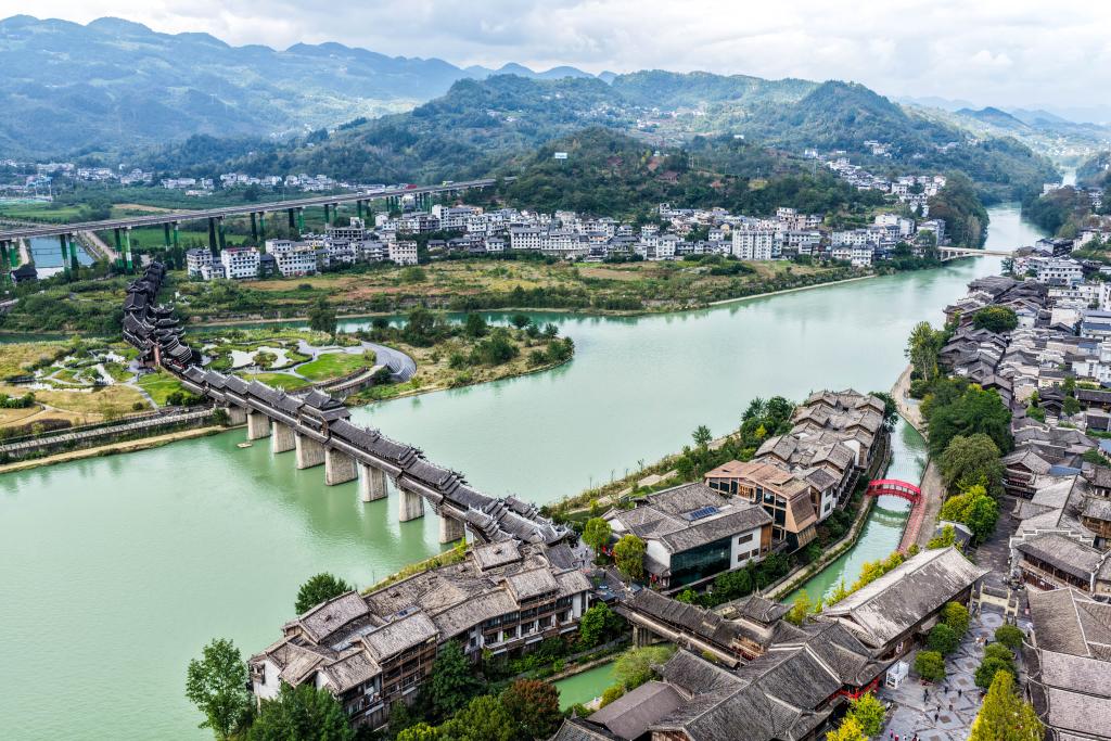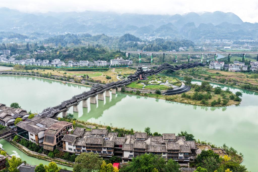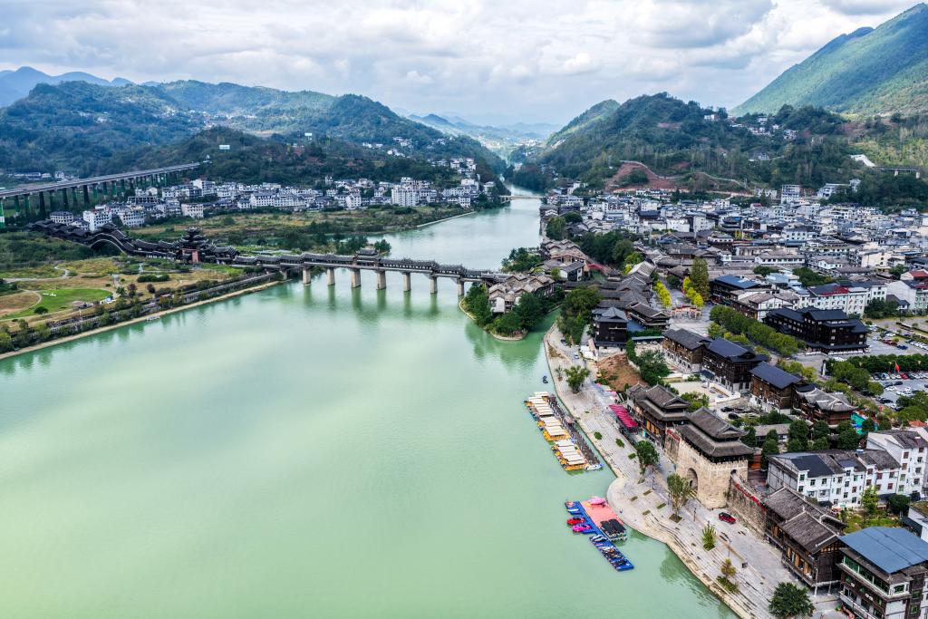 10月30日、濯水古鎮にある伝統建築の屋根付き橋「風雨廊橋」。(ドローンから、重慶=新華社記者/唐奕)