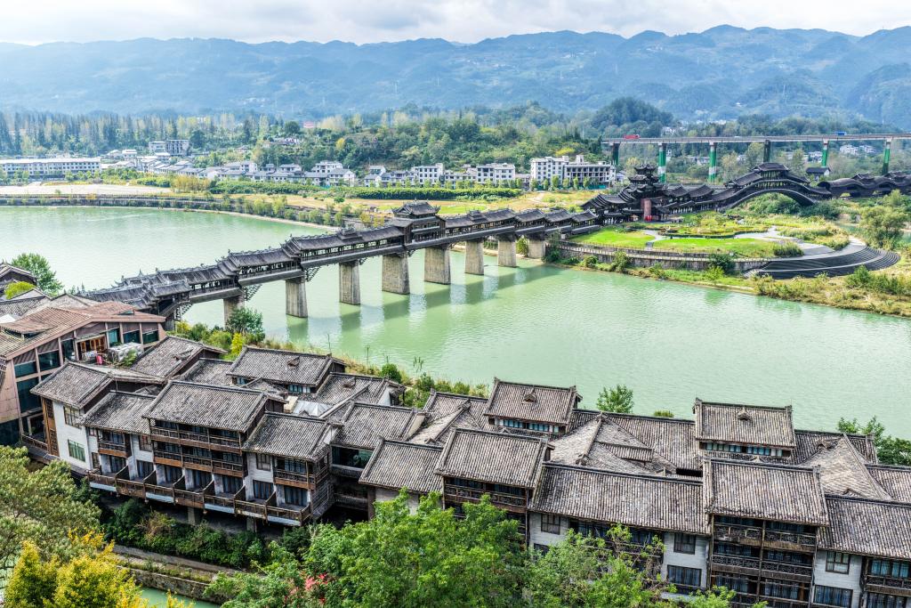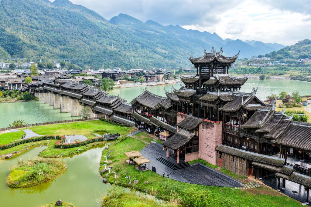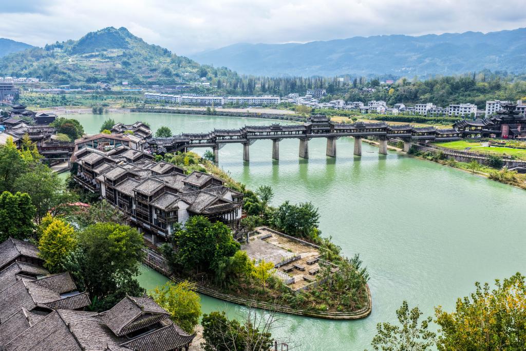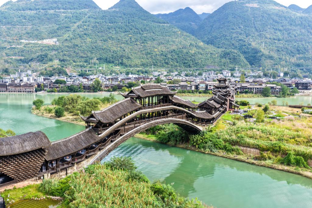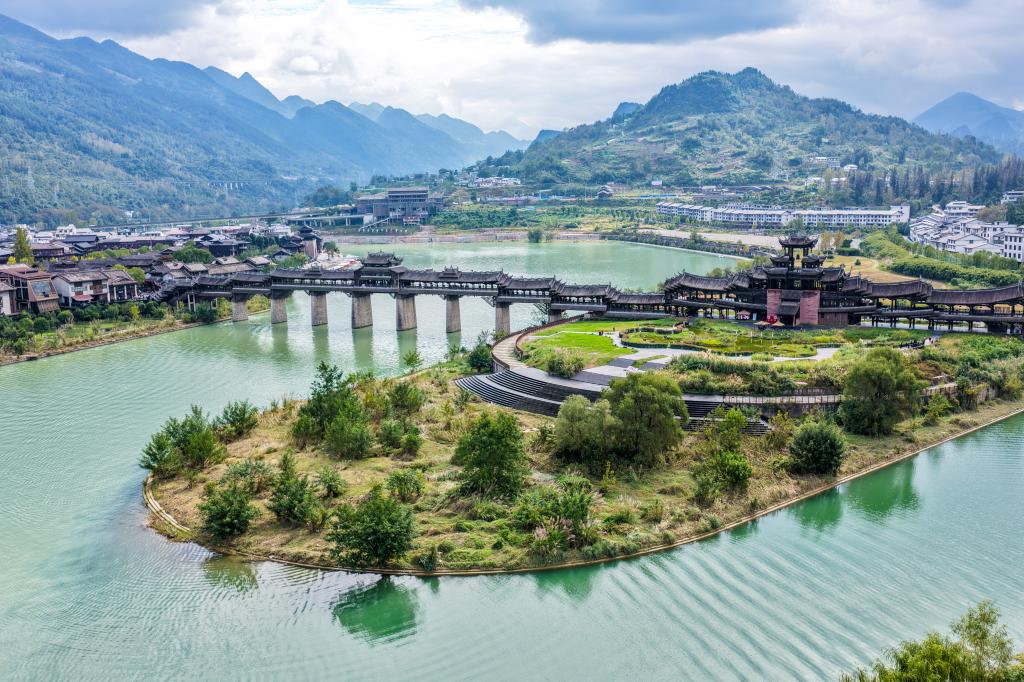 10月30日、濯水古鎮にある伝統建築の屋根付き橋「風雨廊橋」。(ドローンから、重慶=新華社記者/唐奕)