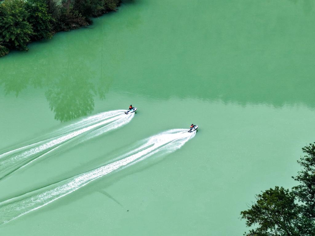 10月30日、濯水古鎮近くの阿蓬江で水上オートバイを楽しむウオータースポーツの愛好家。(ドローンから、重慶=新華社記者/唐奕)