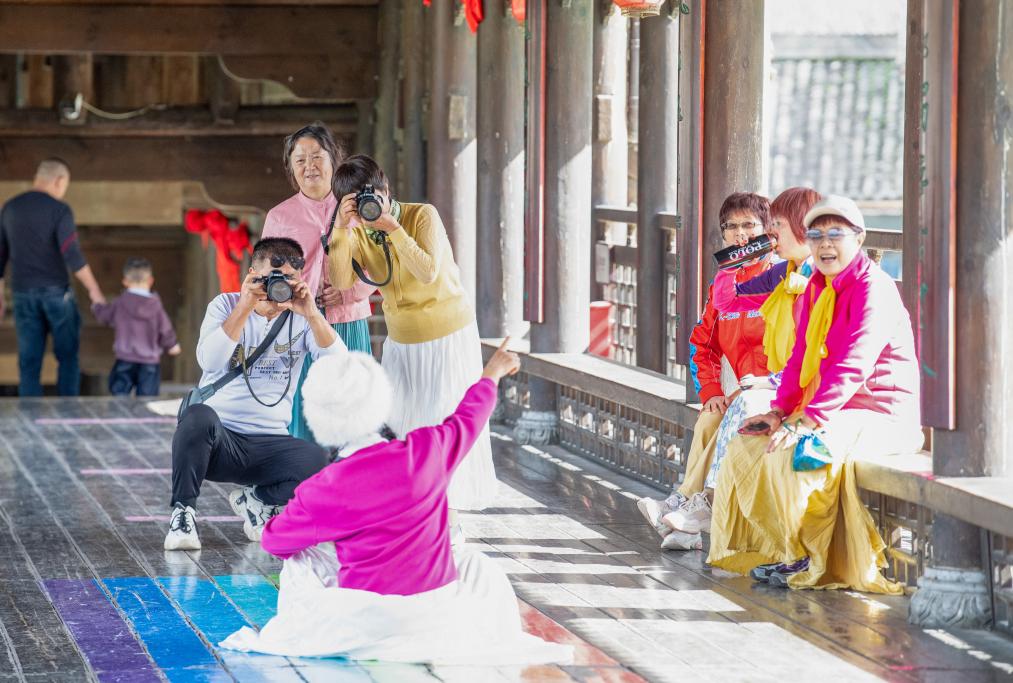 10月30日、濯水古鎮にある伝統建築の屋根付き橋「風雨廊橋」で記念撮影する観光客。(重慶=新華社記者/唐奕)
