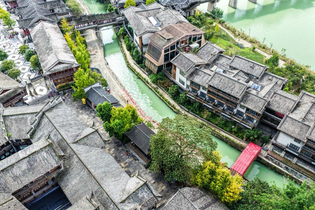 10月30日、空から見た濯水古鎮。(ドローンから、重慶=新華社記者/唐奕)
