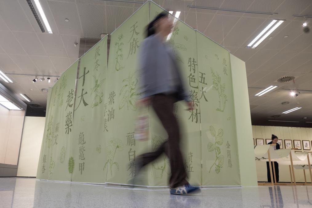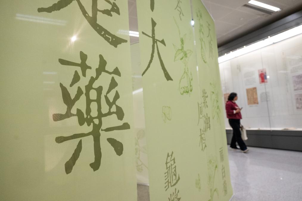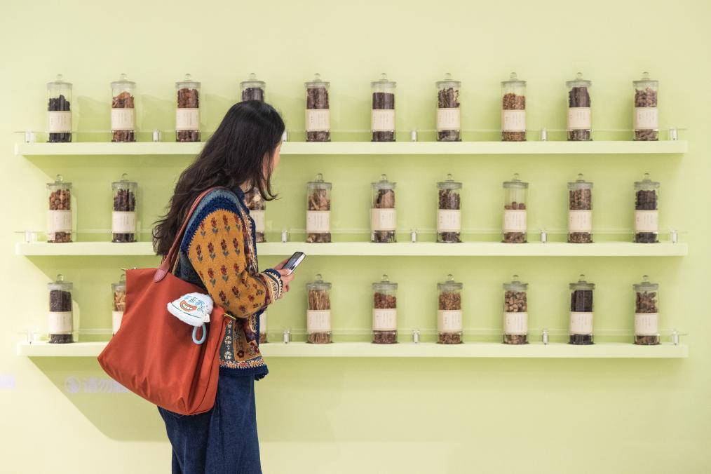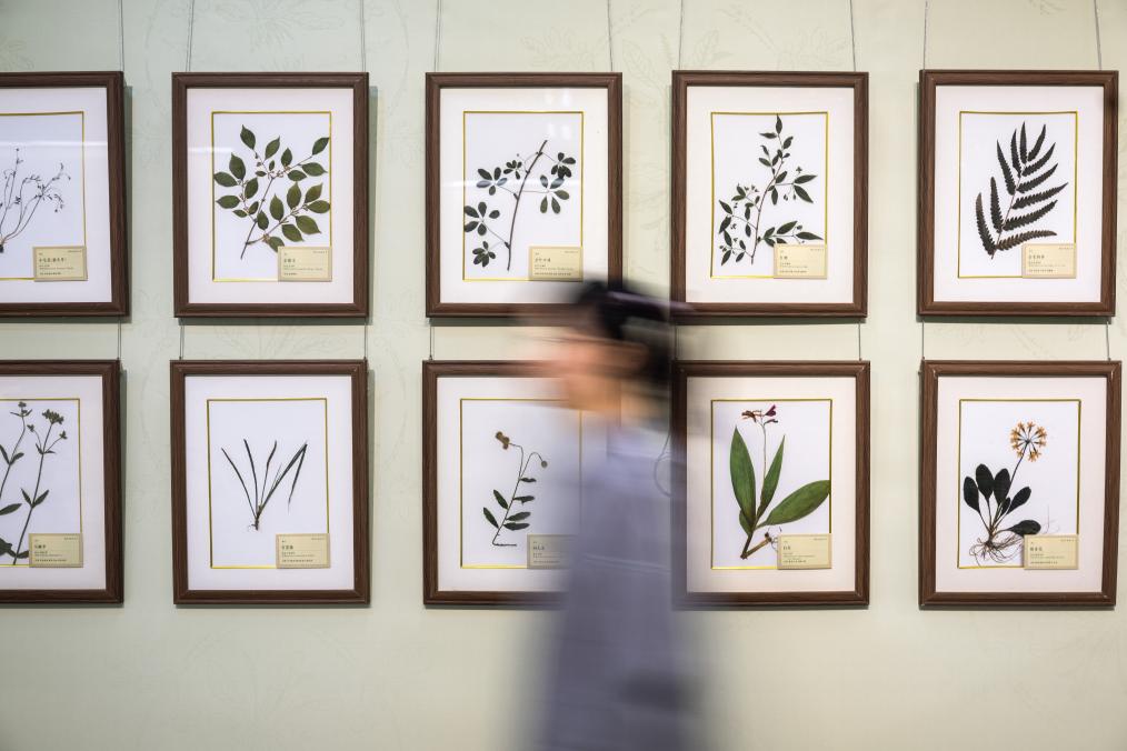 10月28日、湖北省図書館「医脈楚天 典蔵万象—湖北中医薬古籍文献特別展」で、展示された中薬(中国伝統薬)標本を見る人。(武漢=新華社記者/肖芸九)