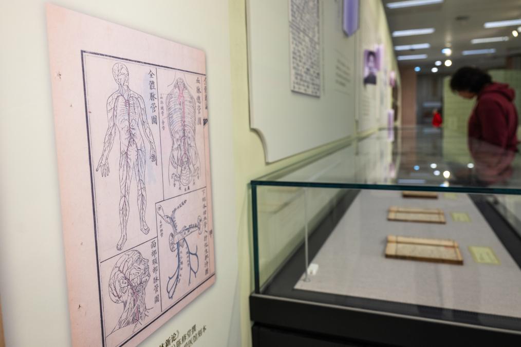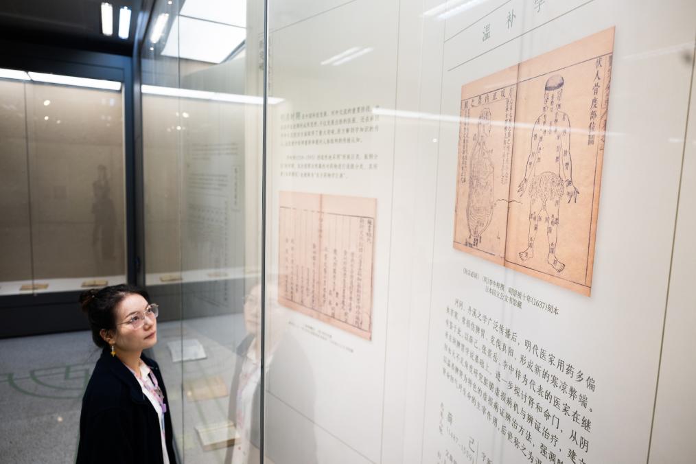 10月28日、湖北省図書館「医脈楚天 典蔵万象—湖北中医薬古籍文献特別展」で展示を見る人。(武漢=新華社記者/肖芸九)
