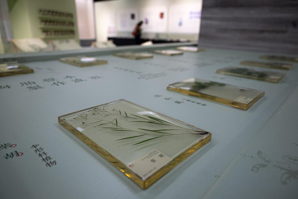 10月28日、湖北省図書館「医脈楚天 典蔵万象—湖北中医薬古籍文献特別展」に展示された中薬(中国伝統薬)標本。(武漢=新華社記者/肖芸九)