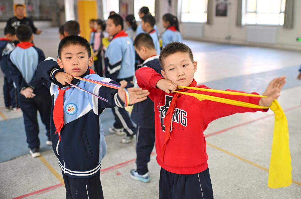 10月23日、伊寧市第25小学校でゴムバンドを使って弓術の動作を練習する弓術クラブの児童ら。(伊寧=新華社記者/胡虎虎)