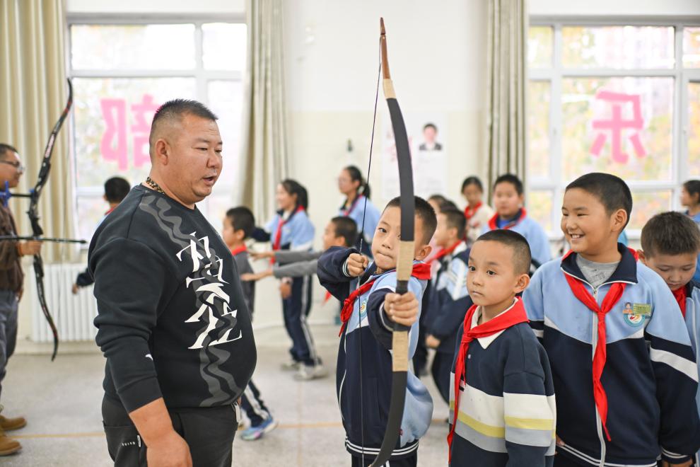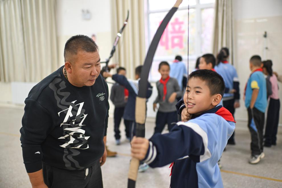 10月23日、伊寧市第25小学校で弓術クラブの児童らに伝統弓を指導する呉俊亮さん(左)。(伊寧=新華社記者/胡虎虎)