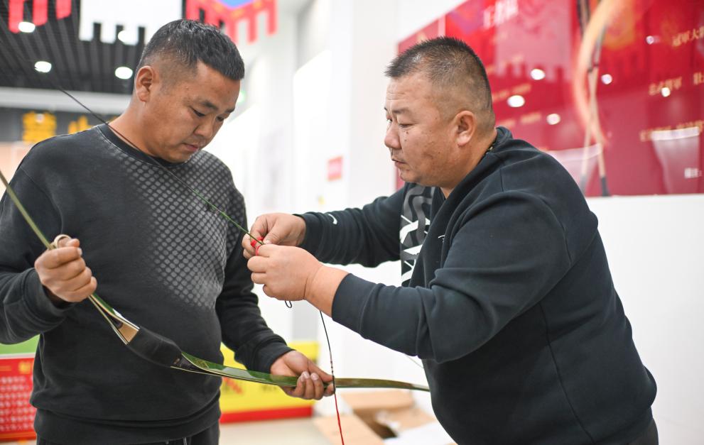 10月23日、伊寧市の旧市街文化観光区にある弓術館で、弓弦の手入れをする呉俊亮さん(右)。(伊寧=新華社記者/胡虎虎)