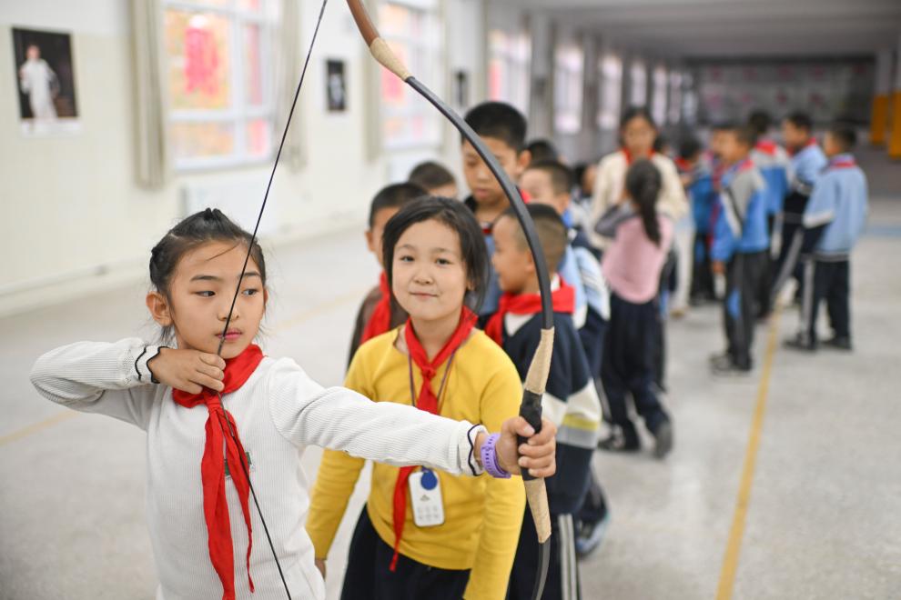 10月23日、伊寧市第25小学校で、列に並んで伝統弓を体験する弓術クラブの児童ら。(伊寧=新華社記者/胡虎虎)