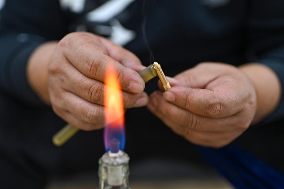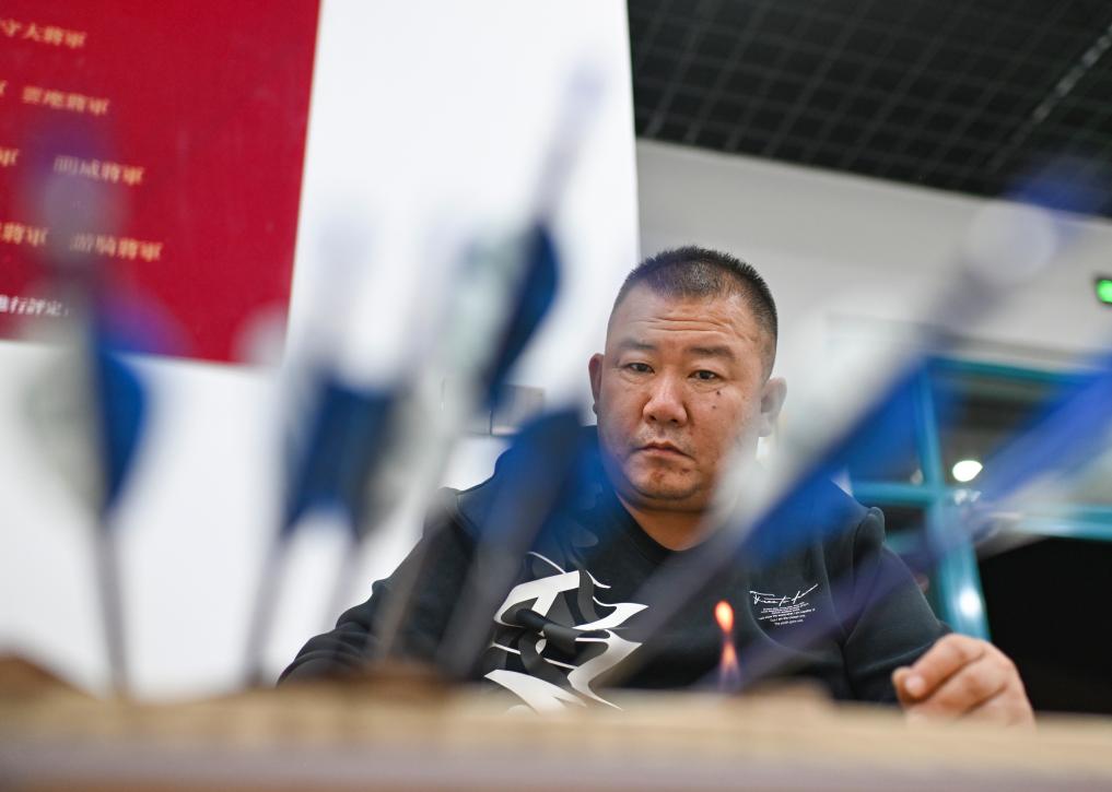 10月23日、伊寧市にある弓術館で矢じりを組み立てる呉俊亮さん。(伊寧=新華社記者/胡虎虎)